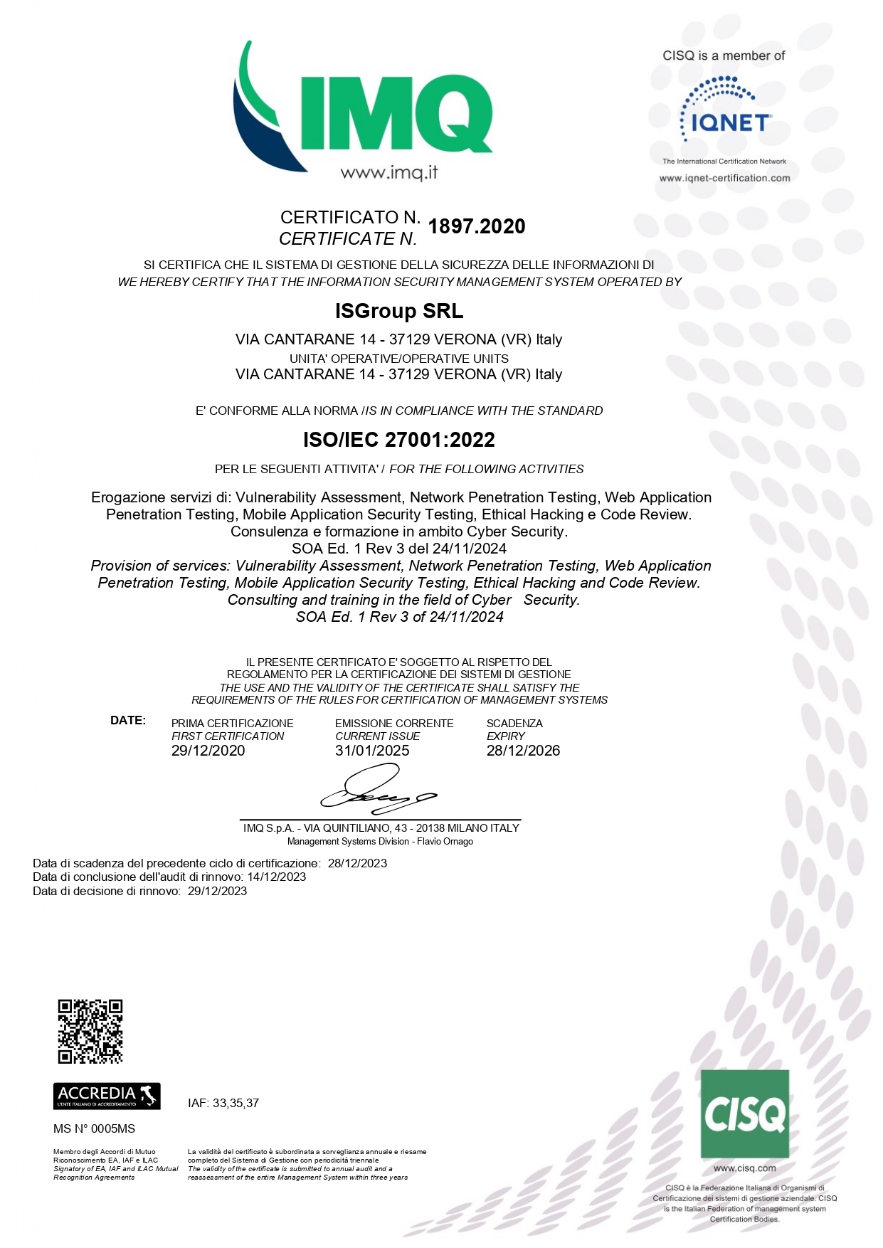 El 31 de enero de 2025, ISGroup SRL obtuvo la certificación según la nueva norma internacional UNI CEI EN ISO/IEC 27001:2022, reafirmando así su compromiso concreto y continuo con la protección de la información y la seguridad de los sistemas.